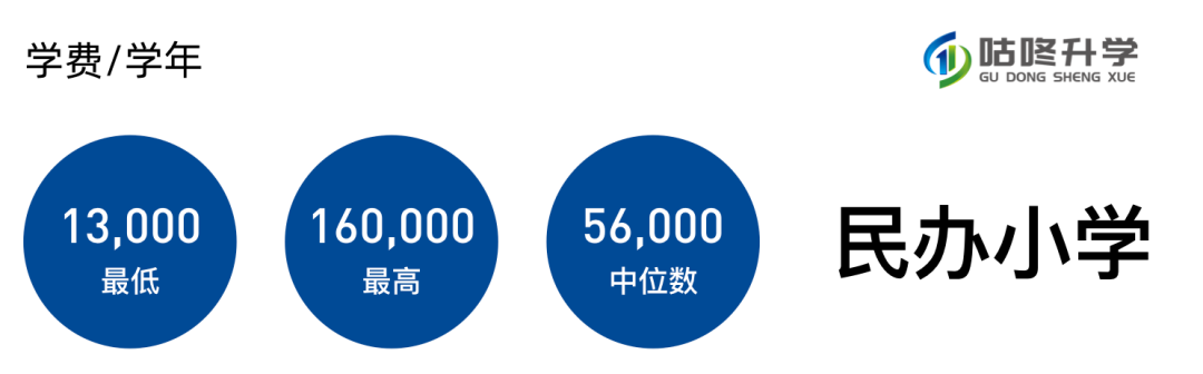 根据咕咚升学导航仪后台数据,以2019年为例,所有招生的民办小学中,收费最高的为160,000元/学年,最低的为13,000元/学年,中位数为56,000元/年。