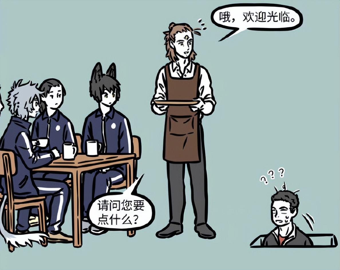 经过了漫长的地道探索之后,体育老师终于来到了地道的出口,等待他的是咖啡厅服务员打扮的二郎神以及一句“欢迎光临,请问您要点什么”,而哮天就坐在不远处和同学们一起喝咖啡!