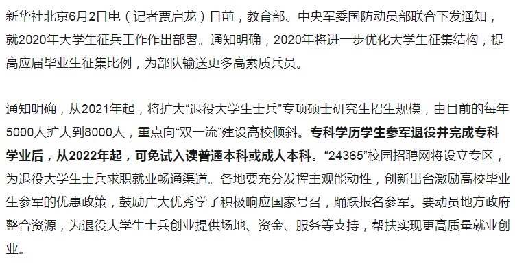 这也就是说,大学生只要在专科期间主动参军,并成功退伍,即可享有免试进入普通本科和成人本科的资格。
