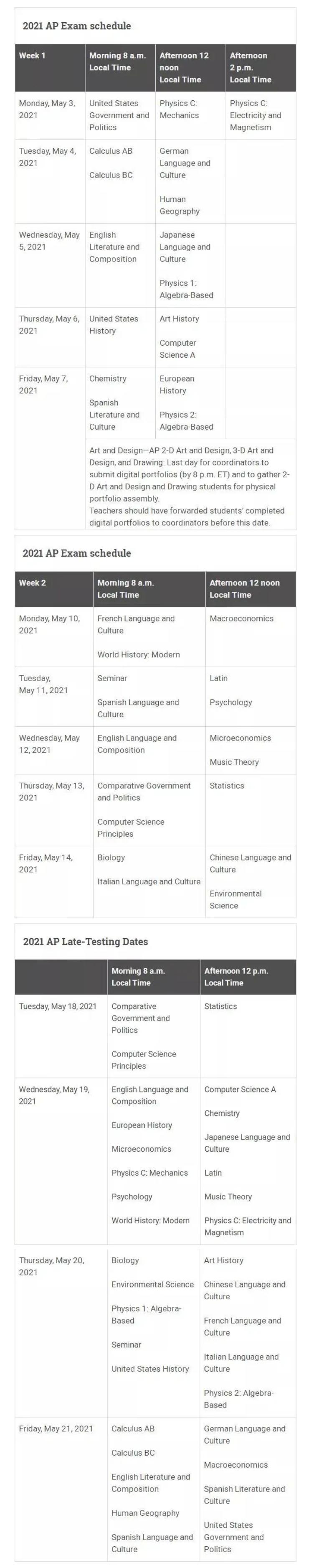 2021年AP考试时间,将在2021年5月3日-14日举行,延迟考试将在2021年5月18日-21日举行,具体考试形式是线上还是线下目前尚未公布。