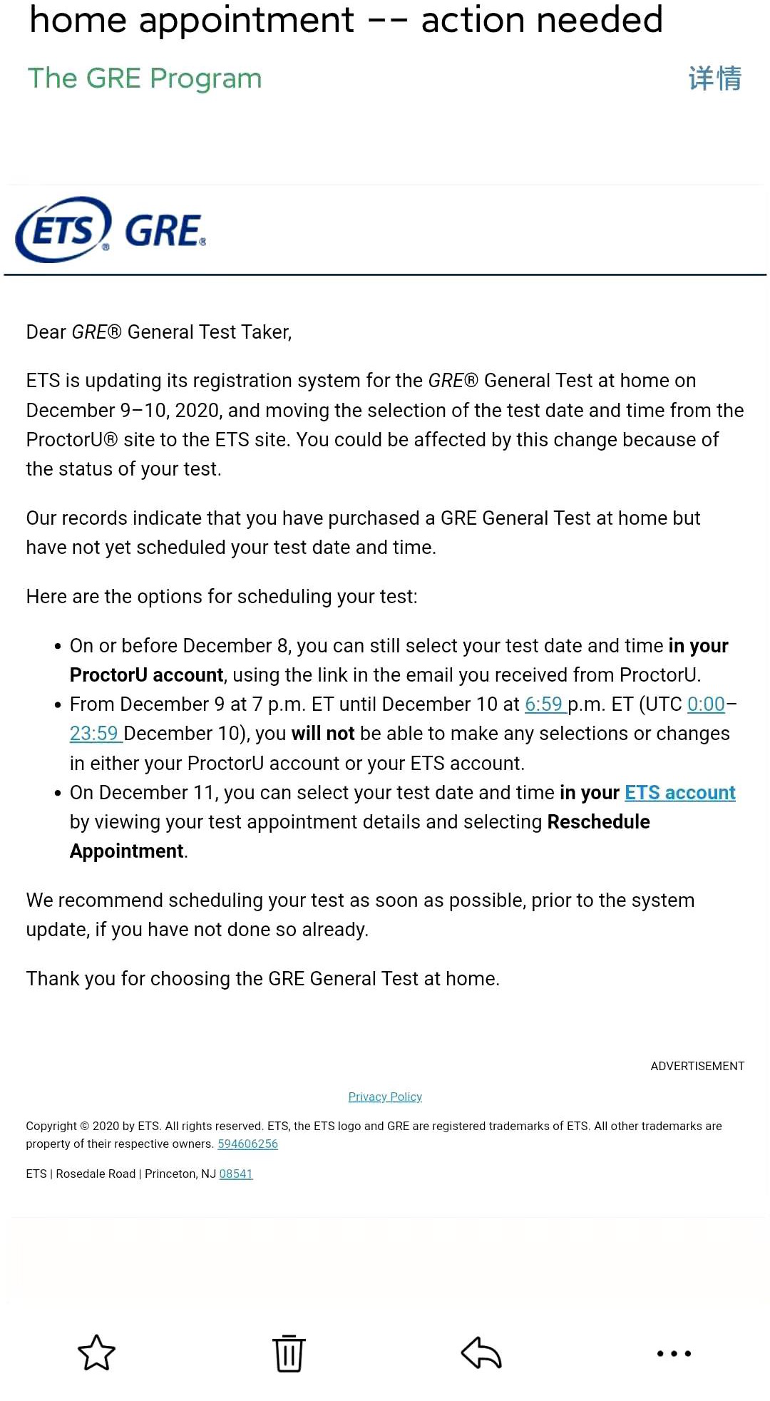 2、从2020年12月11日(美国东部时间)起,所有GRE在家考试的考试时间直接通过ETS官网预约,并且执行和线下考试相同的转考政策。简单说,就是取消GRE在家考免费转考的政策。