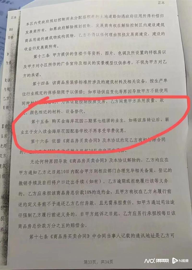 业主提供的相关文件显示,五组团及七组团的购房合同均有体现业主子女入读金海岸实验学校有学费优惠,如七组团的购房补充协议称“购买金海岸花园二期第七组团的业主,如将该房转让后,新业主子女入读金海岸花园配套学校不再享受学费优惠。”