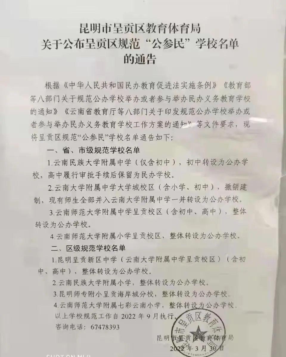 根据《中华人民共和国民办教育促进法实施条例》 《教育部等八部门关于规范公办学校举办或者参与举办民办义务教育学校的通知》 《云南省教育厅等八部门关于印发规范公办学校举办或者参与举办民办义务教育学校工作方案的通知》等文件要求,现将呈贡区规范“公参民”学校名单通告如下: