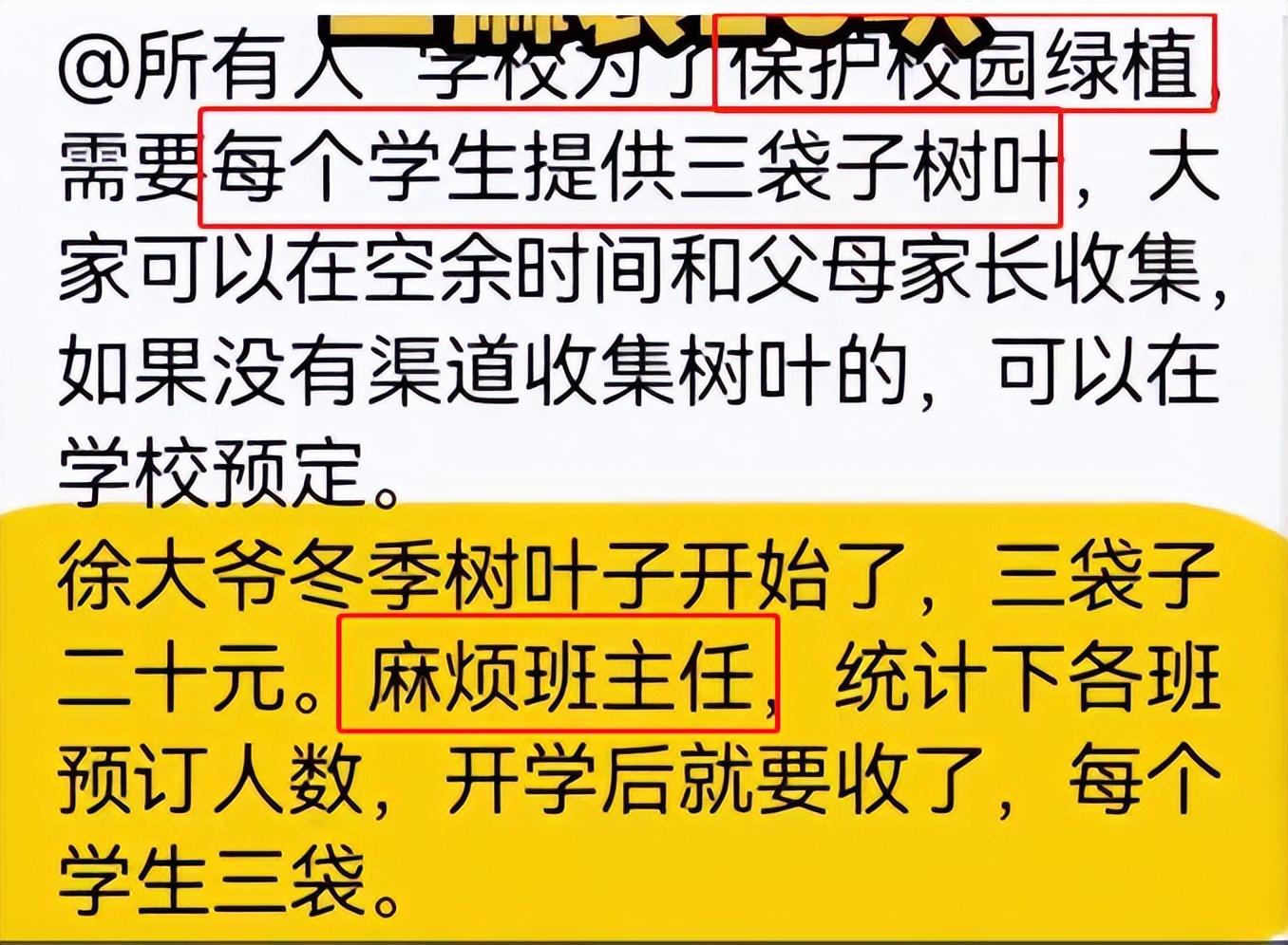 这个“徐大爷”又到底是谁的大爷?这个人际关系,相信很容易就能查出来,如果就是一名朴实的收树叶的大爷,与学校任何老师都毫无关系,相信家长们也愿意交。毕竟确实没时间也没条件去准备树叶。