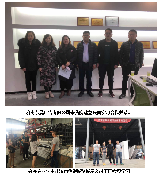 专业教学注重学生实践能力培养和施工经验积累,先后与山东彼得展览展示公司、山东雷鸣展示公司、山东雨桥文化有限公司、山东东晨广告有限公司、山东华晨会展有限公司等优质会展相关企业建立了校企合作关系,为学生实习实训、就业竞争力的综合提升提供了支持。
