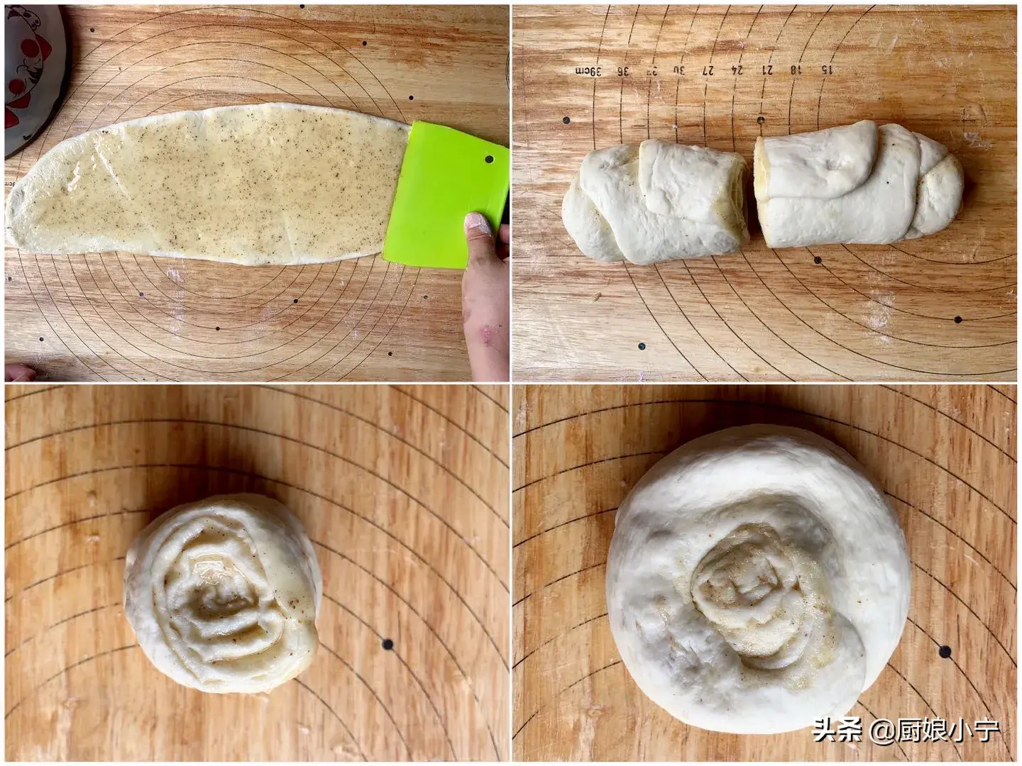 4、再看一下面团,醒发好的面团是原来的两倍大,里边有丰富的蜂窝,面团上撒一些干面粉给它排排气,然后转移到案板上,好好的揉一下,揉成光滑的面团,然后分割成两个部分。擀成薄薄的长条状,把油酥抹上去,用刮板将油酥刮平,然后拿着一头,一边抻拉一边卷起来,这样做出的饼层次更多。