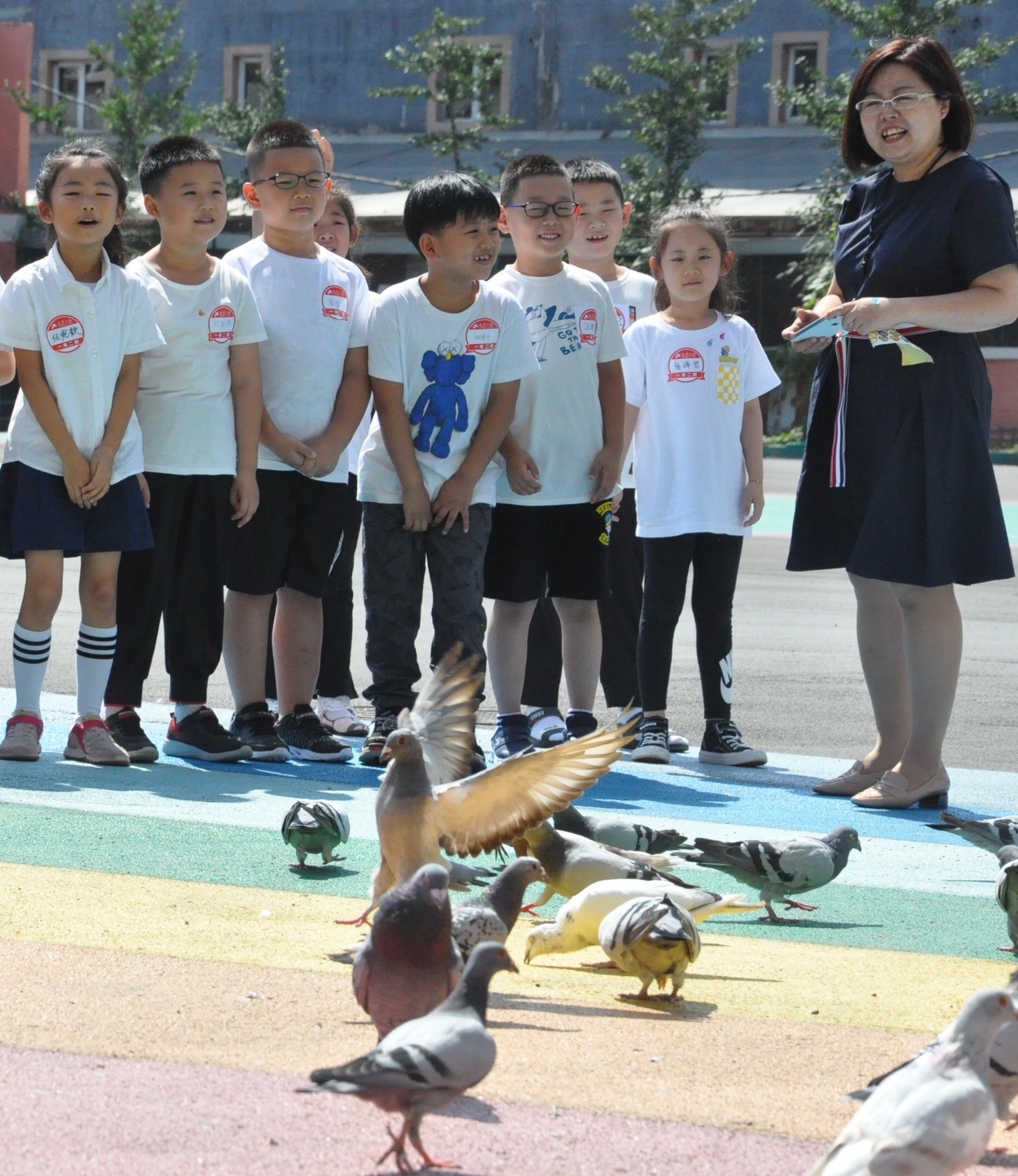 为了让新生们对校园增加了解,整个上午,一年二班近50个“小豆包”在班主任的带领下进行了校园探险。他们不仅熟悉了教室、图书馆、体育馆、卫生间、医务室、食堂的位置,还认识了新朋友——老杨树和和平鸽。“和平鸽是我们和平一校的象征,他们也是我们的好朋友,同学们今后可以带一些谷物来喂食。”在老师的带领下,孩子们起初只是离得远远地观察,有的慢慢靠近了扔些谷物,最后胆子大的干脆走到鸽群中间,与和平鸽成了好朋友。和平一校总校的教学楼前有一棵百年树龄的杨树。“哇,一百年,年纪太大了!”“小豆包”们站在树荫里,仰望茂密的树冠,不禁发出感叹。