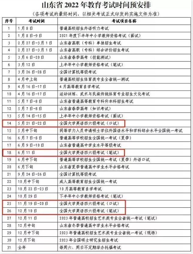 至于具体的时间安排,还要考四六级官网进行统筹和通知,虽然现在四六级官网还没有发布通知,但山东省却发布了教育考试安排。