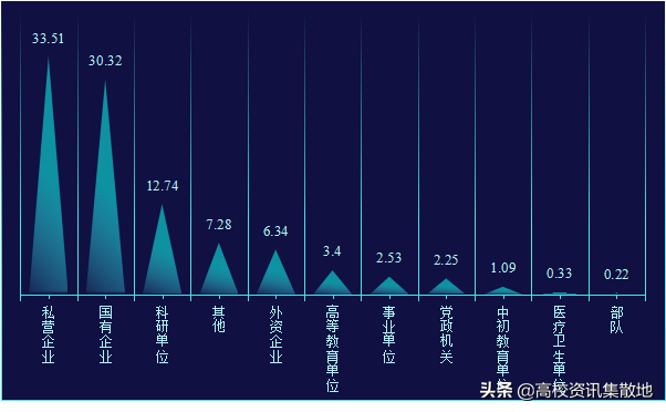 据统计,2019届毕业生入校招聘单位共计6405家,根据招聘单位的性质,排在第一位的是私营企业、占比达33.51%,排在第二位的是国有企业、占比达30.32%,排在第三位的是科研单位、占比达12.74%。