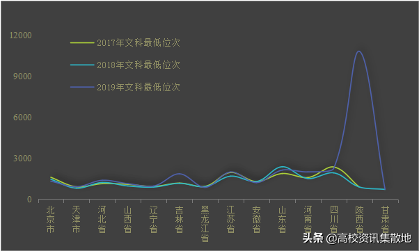 我们都知道,高考成绩单上有高考分数和位次,能否被你目标院校录取不是由分数决定而是由你的位次决定的。因此,我们对哈工大在2017年-2019年三年高考在招生省市的最低录取位次进行了分析: