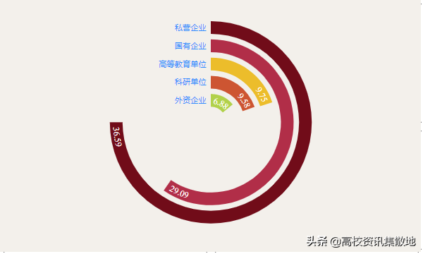 根据哈工大2019年毕业生就业质量报告,按照就业单位性质进行分类,大学生毕业后主要想去的企业性质排名是:第一是私营企业、占比达36.59%,第二是国有企业、占比达29.09,其次是高等院校单位和科研单位、占比分别达9.58%和9.75%。