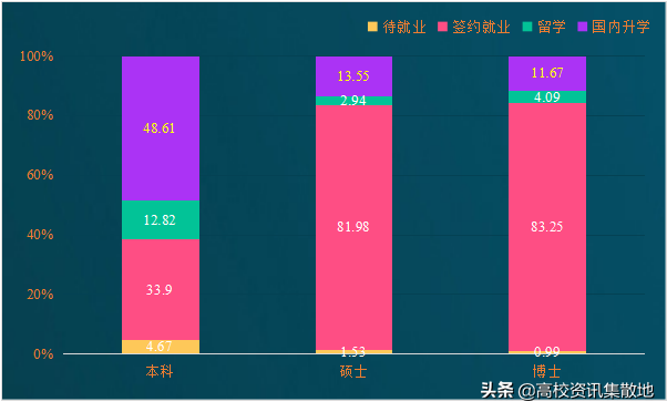 本科毕业生共3729人,其中国内升学的占比48.61%、留学12.82%、签约就业33.9%、待就业4.67%。可以看出本科生更倾向于继续深造,占比共达到61.43%。