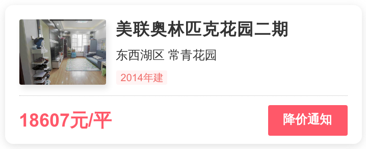 长青壹号(建筑年代:2019;均价:12250.0元/㎡) 美联奥林匹克花园五期(建筑年代:2017;均价:16642.5元/㎡) 愿景时代(建筑年代:2016;均价:11925.1元/㎡) 美联奥林匹克花园四期(建筑年代:2015;均价:17541.1元/㎡) 恒大常青花园六小区(建筑年代:2014;均价:23739.5元/㎡)以上即为幸福里对美联奥林匹克花园二期的测评内容,小区具体信息请以实际情况为准,欢迎下载幸福里app看房选房。