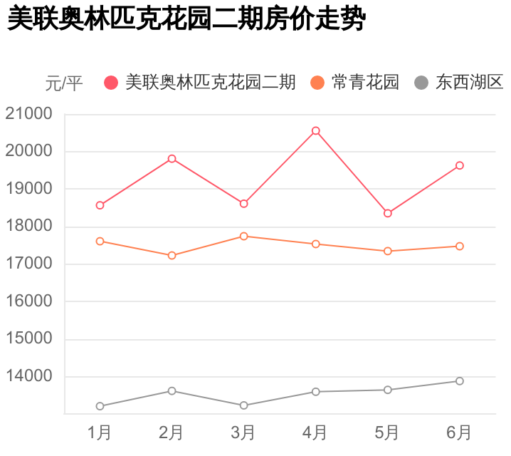 2020年6月为止,小区挂牌均价为18607元/平方米,高出常青花园均价(1.85万/㎡)104元,比东西湖区均价(1.36万/㎡)高约4995元。小区均价处于较高水平,品牌开发商与优质物业管理使小区定位为区域内高端水准。