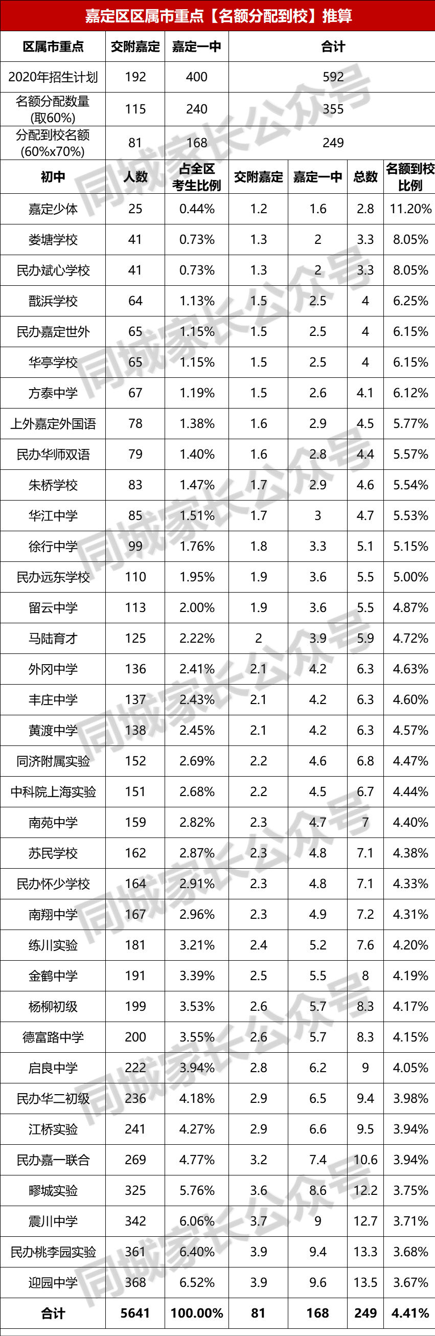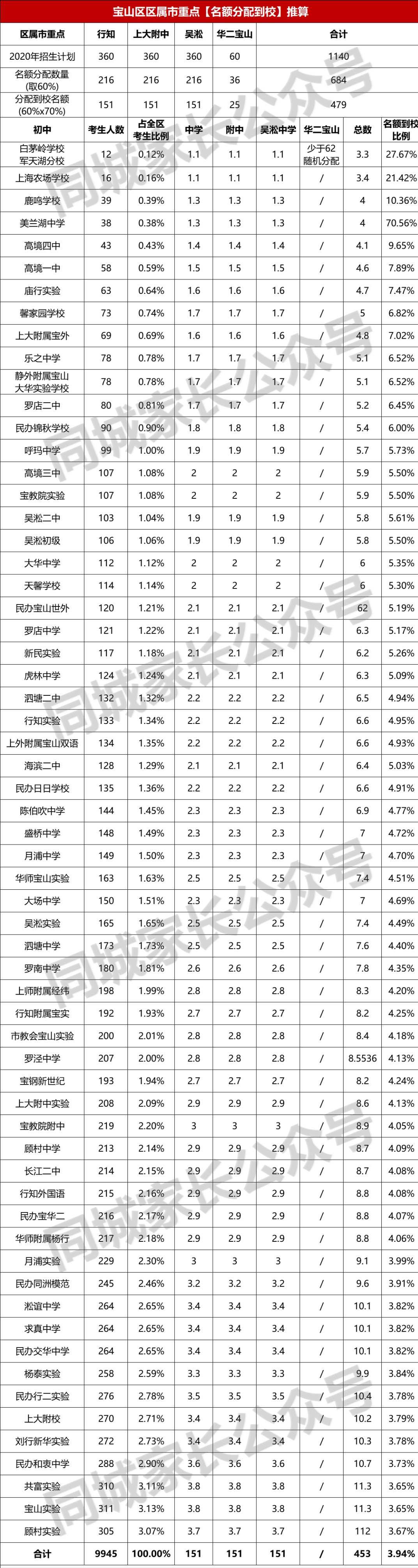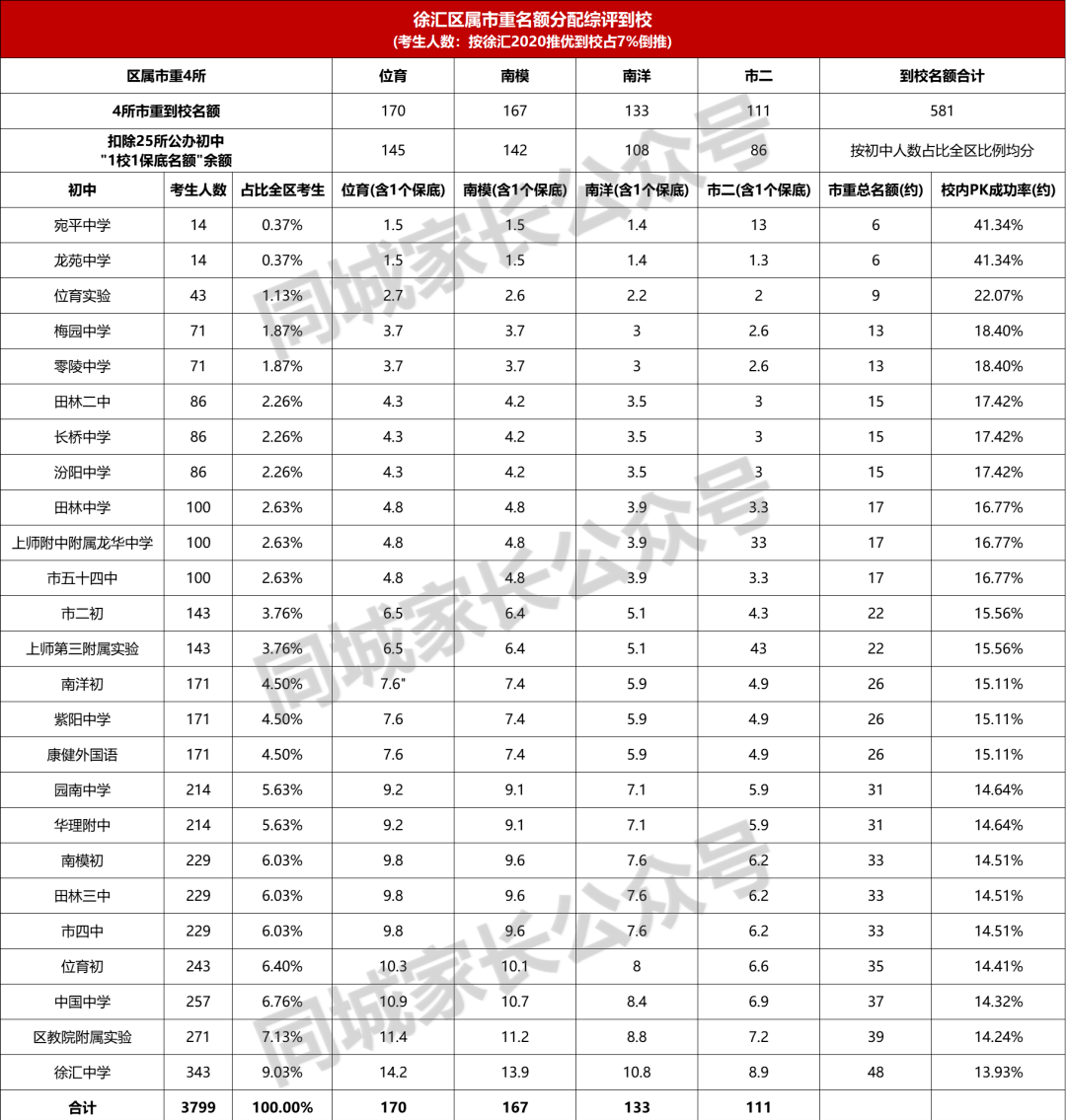 接下来,我们根据2020年中考推荐生7%倒推中考人数,计算出各区各初中名额分配到校人数: