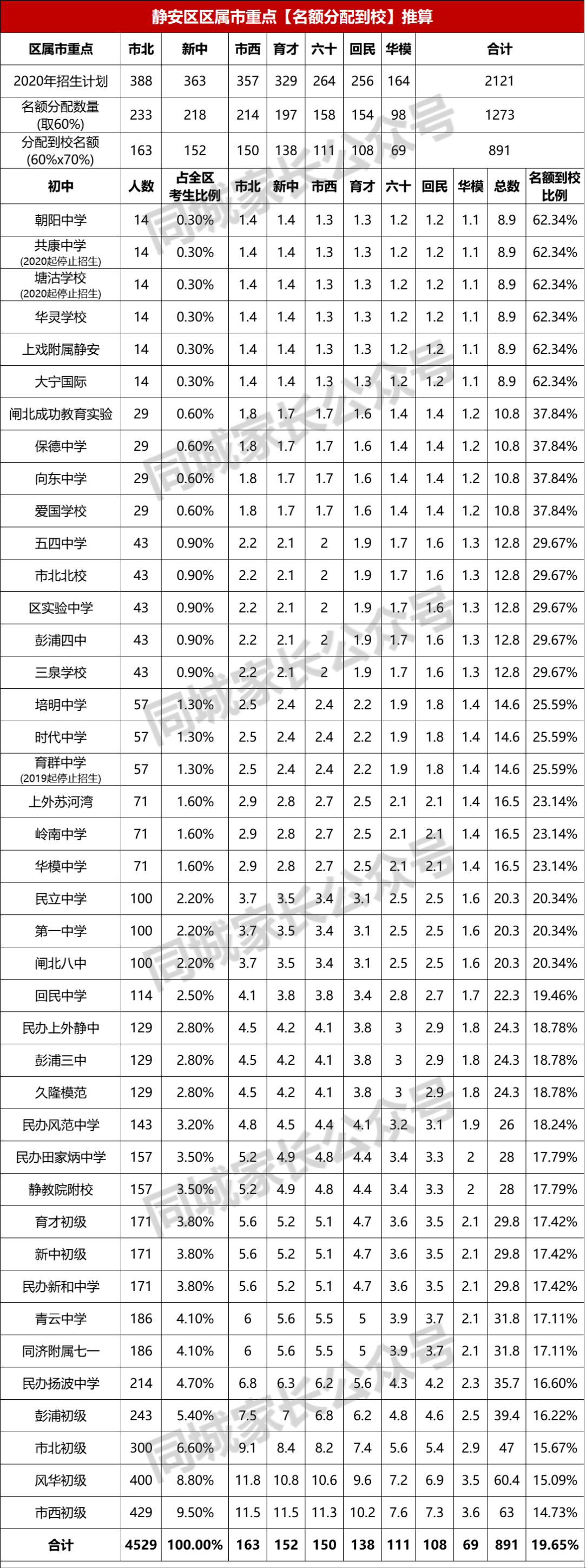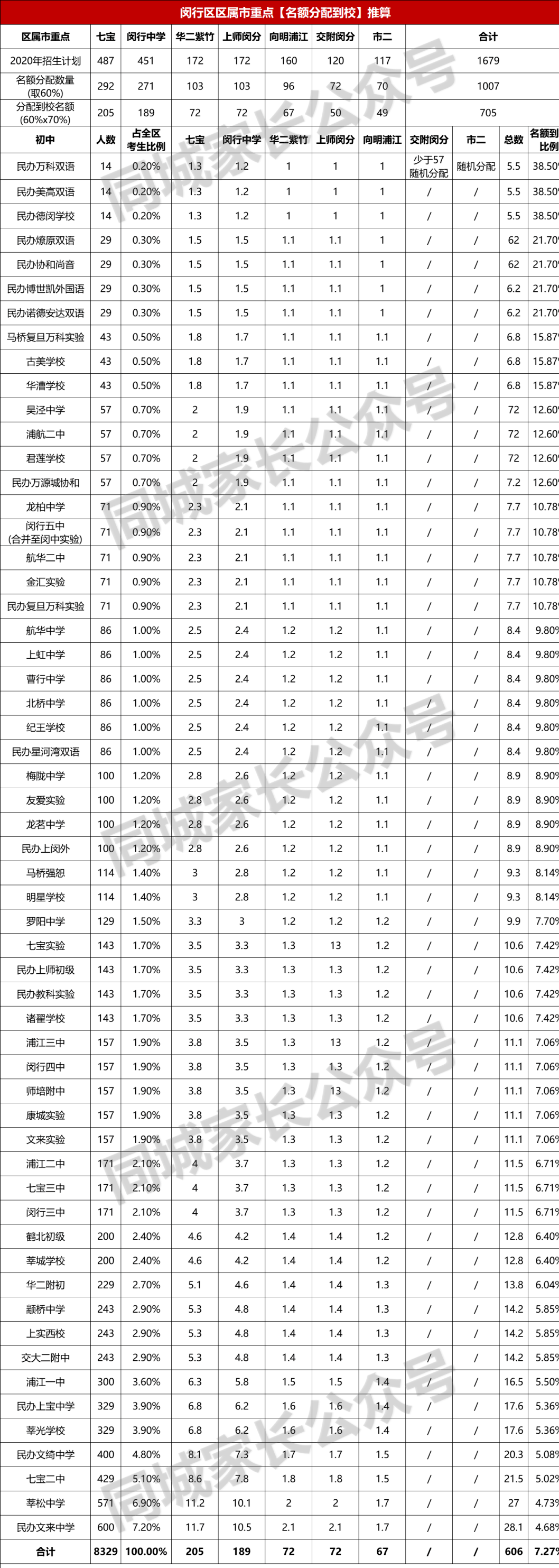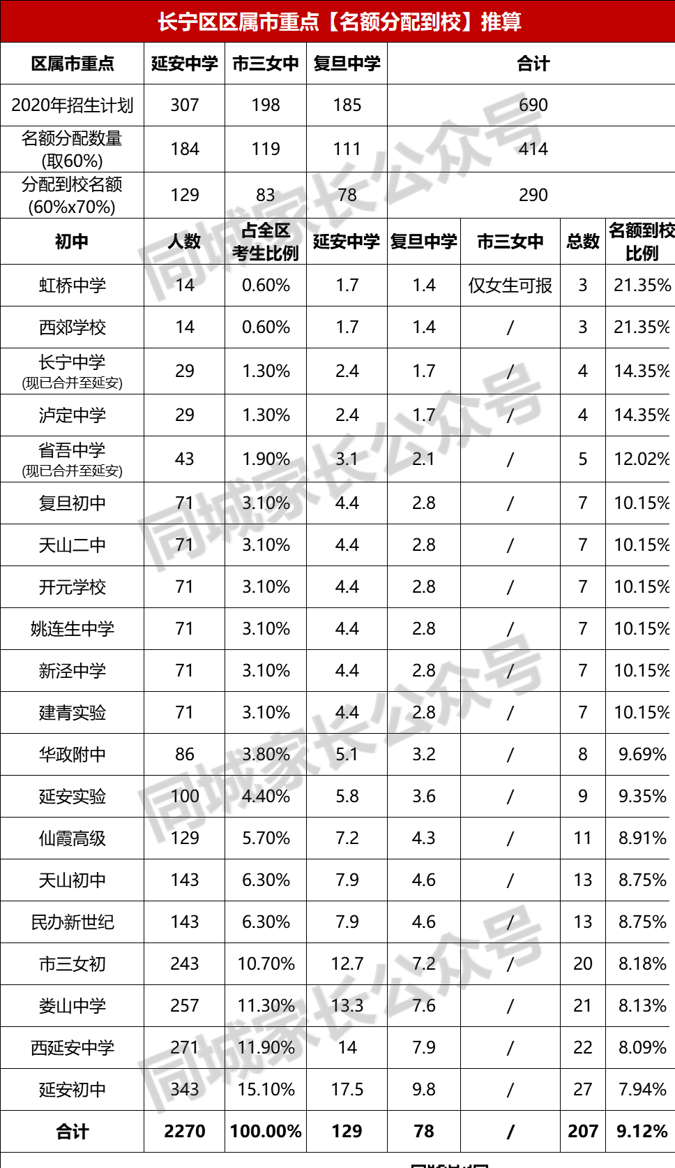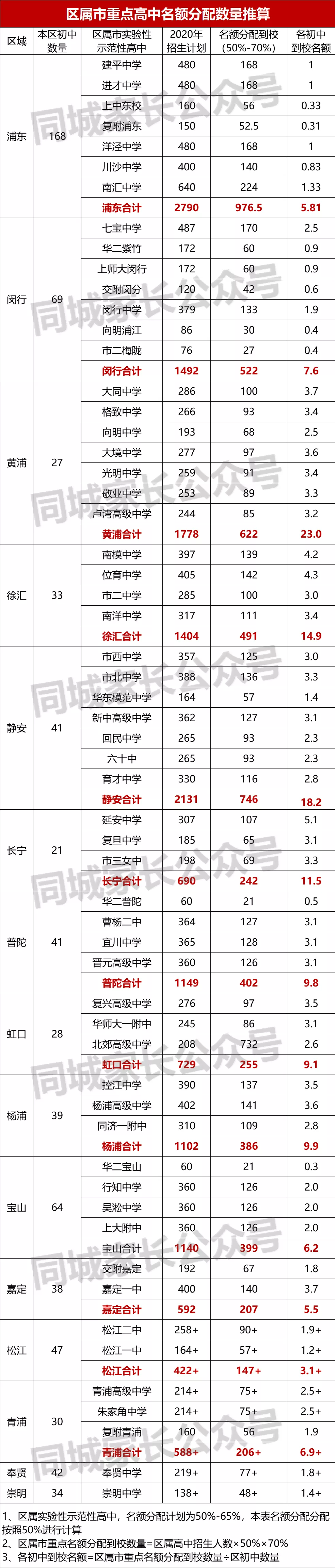 我们根据2020年区属市重点高中的招生计划,为大家推算一下16区初中名额分配到校数量:具体分配到初中的名额数量=当年区属市重点高中招生计划数*名额分配50%-65%(我们取50%)*名额分配到校70%