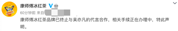 这些聊天记录的公开,也让吴亦凡早上的声明显得更加无力。与他合作的品牌也都在同一时间宣布解约,包括康师傅冰红茶、得宝、华帝等等。