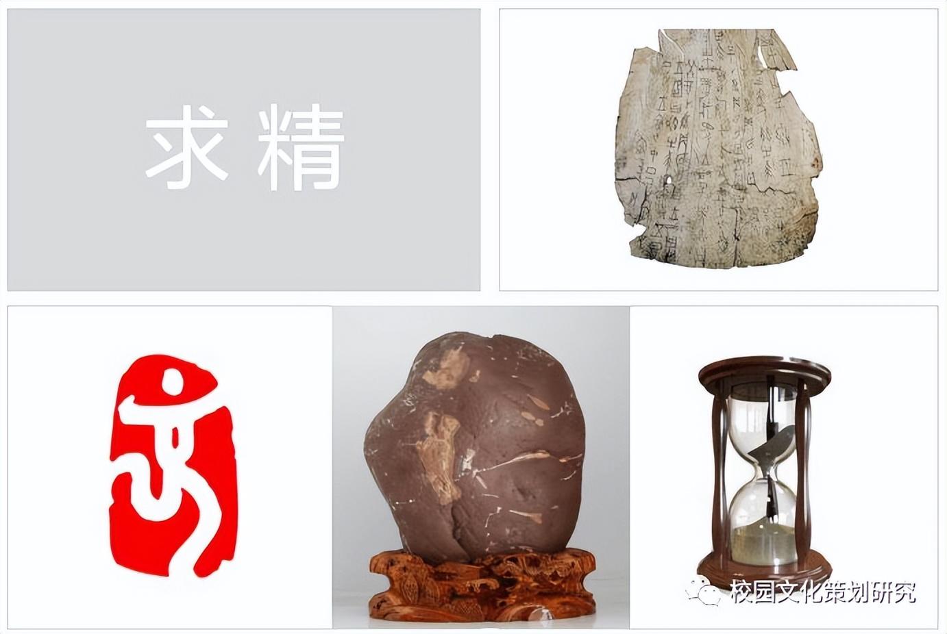 标志由“求精”二字、甲骨文、印章、三峡石、沙漏五个元素构成;