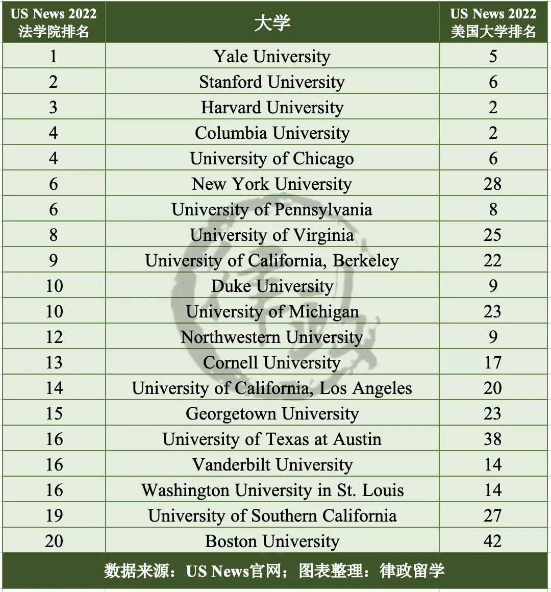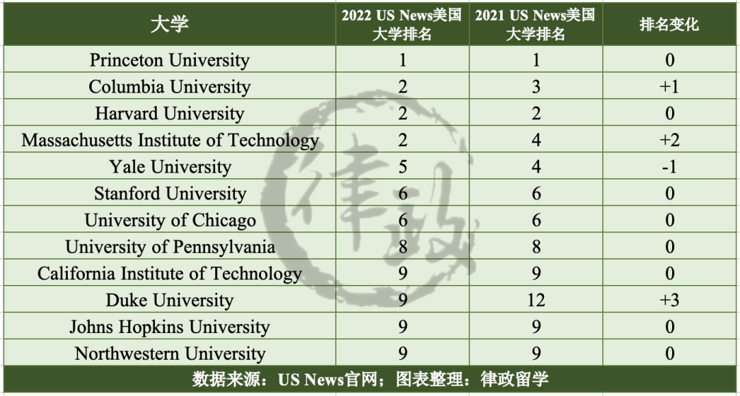 从以上榜单我们可以看出,由于排名方法相较2021年没有明显变化,整体来看,2022美国大学的综合排名变化不大。前10尤其是前5表现稳定,由美国传统顶级院校占据;而US News法学院排名前20所属大学的综合排名也表现不俗。