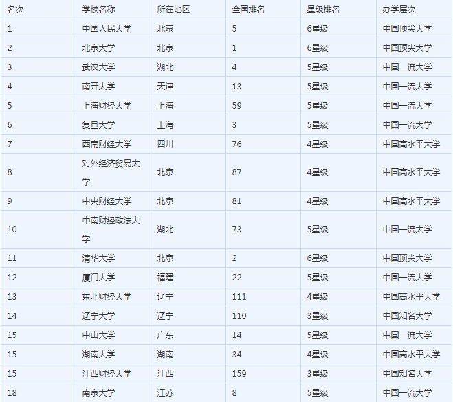 了解了第一名之后,再看看接下来的排名情况,位于第二名的是北京大学,武汉大学第三,然后分别是南开大学、上海财经大学、复旦大学、西南财经大学、对外经济贸易大学、中央财经大学,中南财经政法大学、清华大学以及厦门大学等等,都是实力非常出众的。