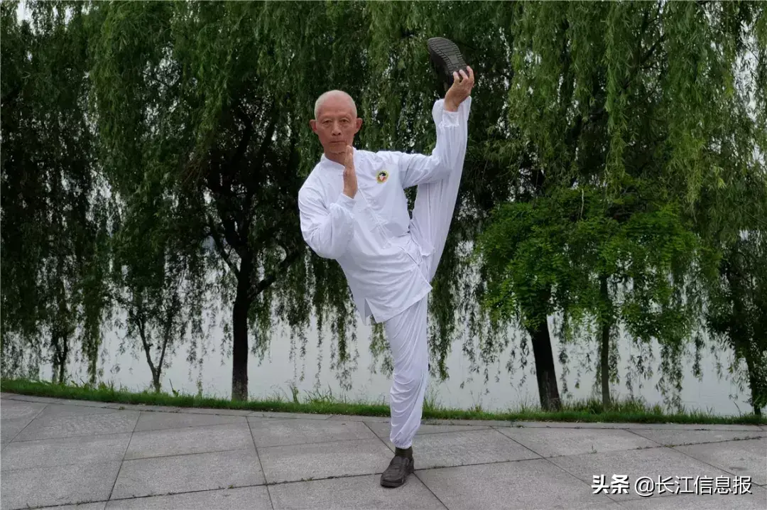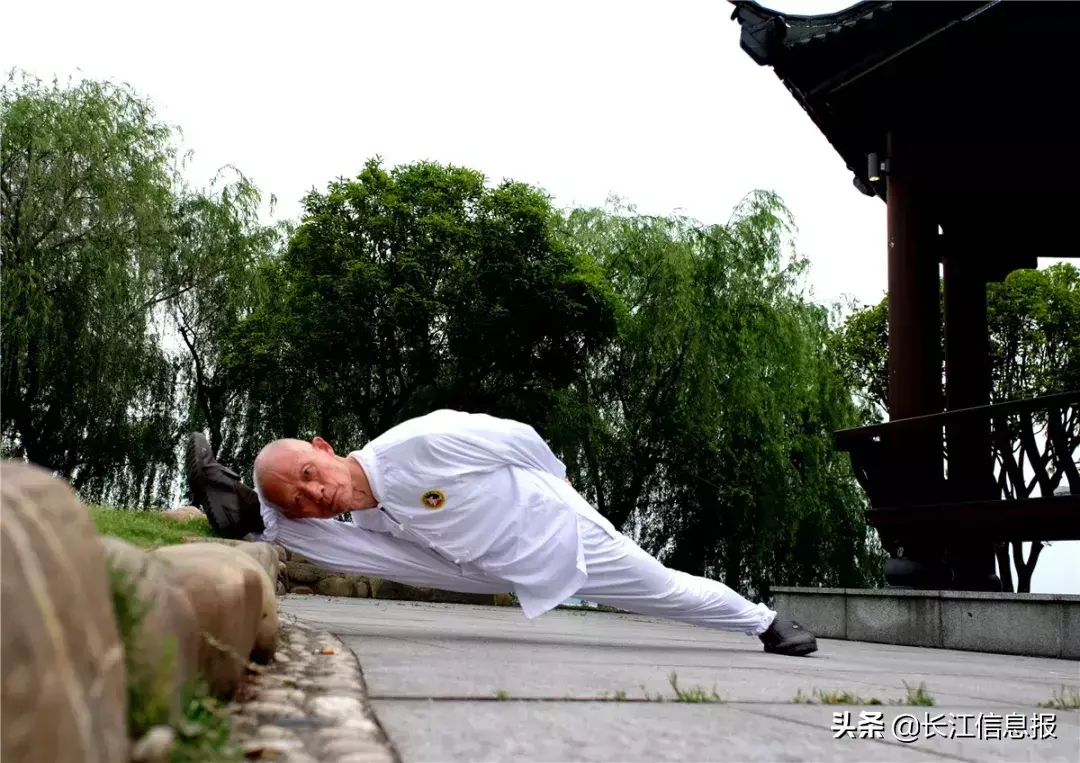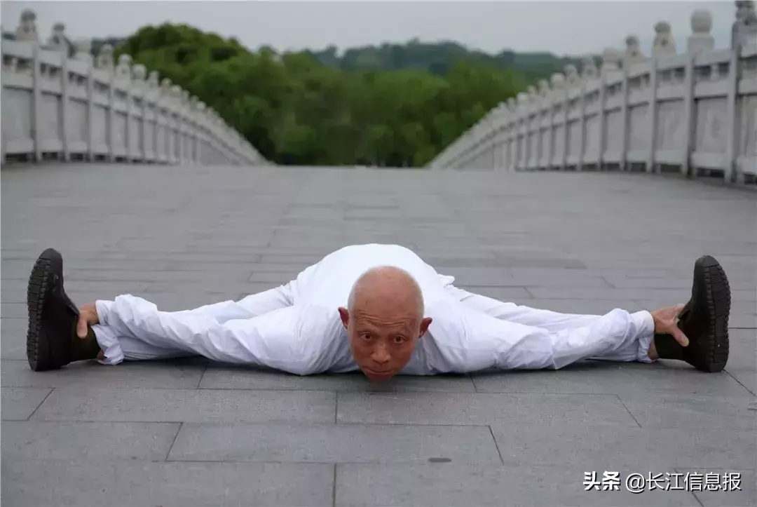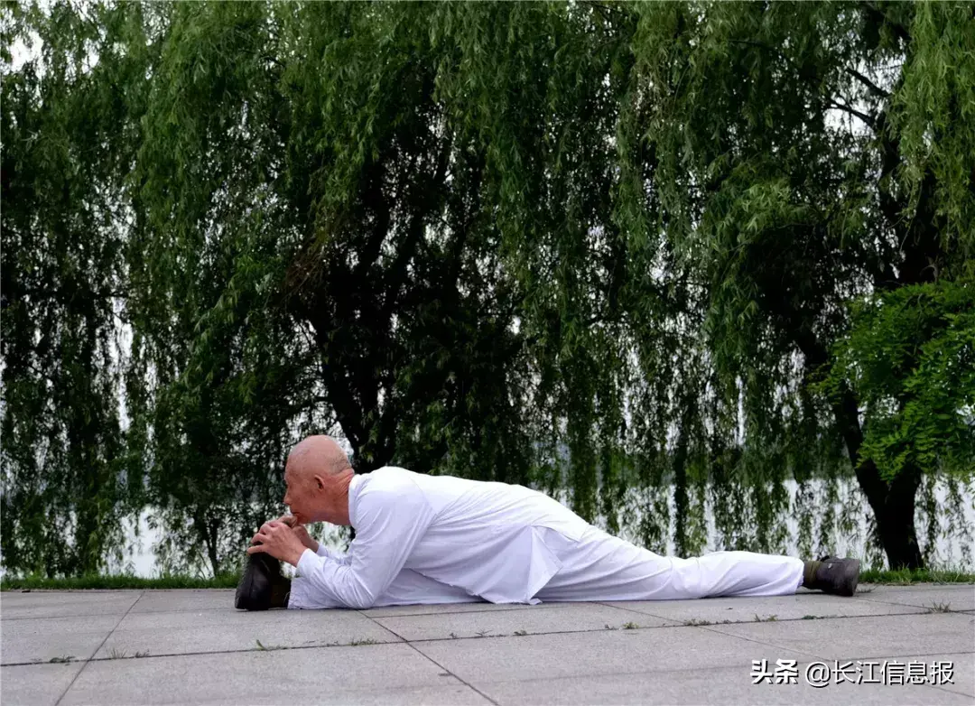 一位鹤发童颜的长者,着一袭洁白运动装,身如矫燕般翻腾着其练就的独门柔术——悬空一字马、朝天蹬、老鹰下山、罗汉睡觉等绝妙功夫,频频引得过往休闲市民驻足称赞并争相与之合影。