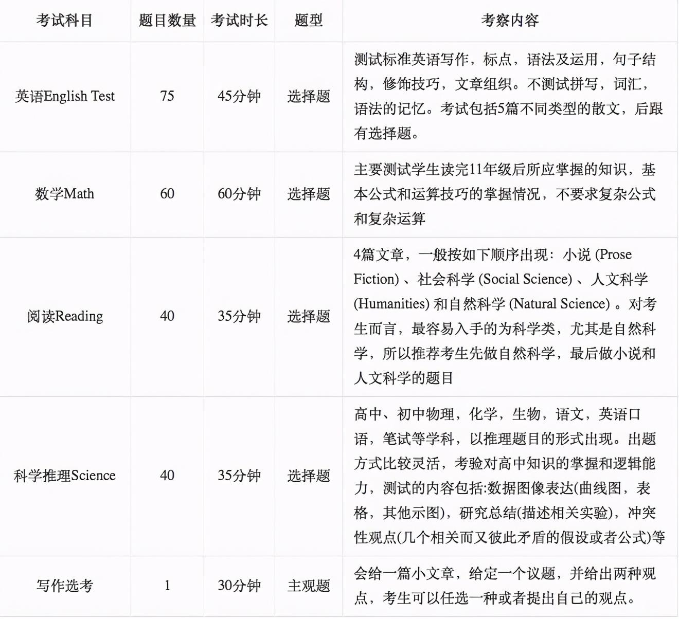 Act的难点在于科学推理,这部分整合高中、初中物理,化学,生物,语文,英语口语,笔试等学科,综合在一张卷子上,以推理题目的形式出现。对于理工科不是很擅长的学生考act会比较吃亏。