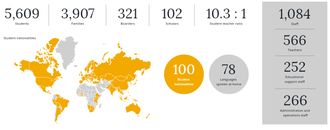 校园拥有最先进的 750 座礼堂、视觉艺术和音乐室、当代设计中心、创新套房、奥林匹克规格的游泳池、独立的幼儿游泳池、全天候运动场、2 个篮球场和 2 个图书馆,藏书超过 27,000 本书。