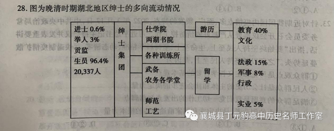 【解析】C本题考查的是晚晴社会结构的变动,晚晴社会遭遇西方列强侵略,中国出现三千年未有之变局,绅士集团面对此变局做出因应,绅士集团内部出现变动,绅士集团内部随着教育方式的变化促使其社会阶层出现变化,对传统的士农工商四民社会结构造成了冲击。A项新式教育并未居于主导地位,从数据来看传统的学校教育(书院私塾)仍占据主导地位(40%),B项材料未体现出科举制度,也未体现选才方式的变化,D项未体现实业救国思潮对职业选择的影响。