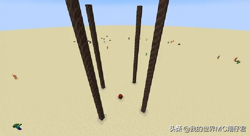 1.在刚刚我们标记的4个方块上面都建一个柱子。这些柱子至少要有25格高,对坠落的怪物提供足够的坠落伤害。