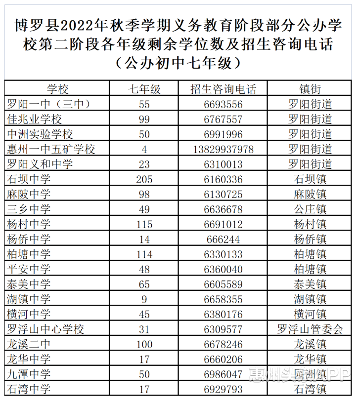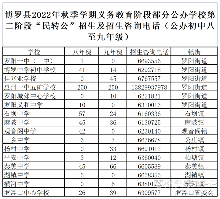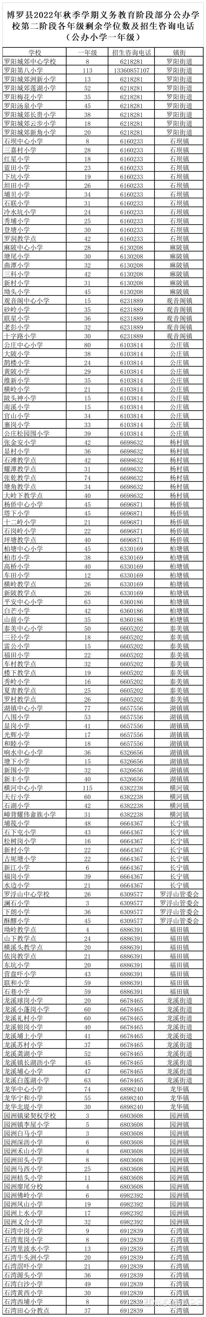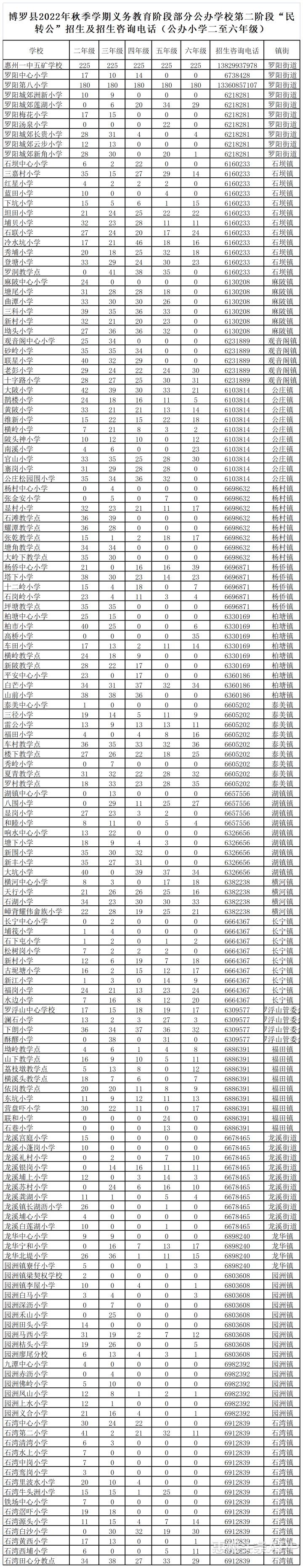据了解,目前博罗县公办学校仍可提供学位18151个。其中,起始年级学位5751个(一年级4543个,初中七年级1208个);其它非起始年级可提供“民转公”公办学位12400个(小学11326个,初中1074个)。各学校各年级可提供学位详见下表。
