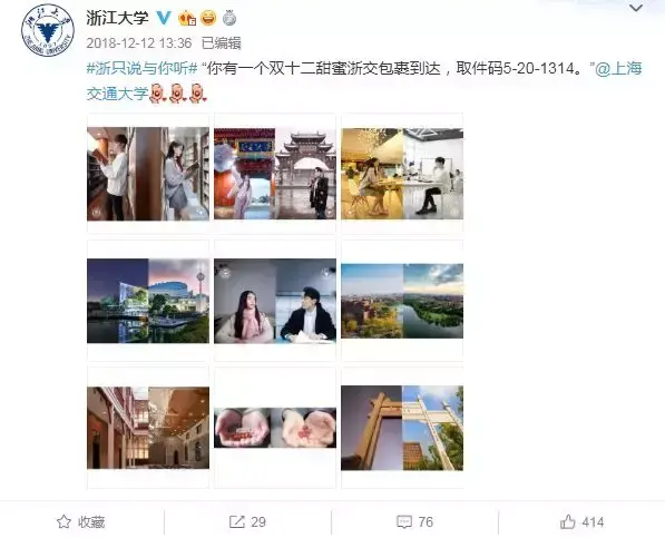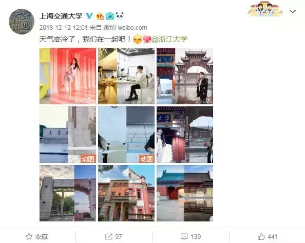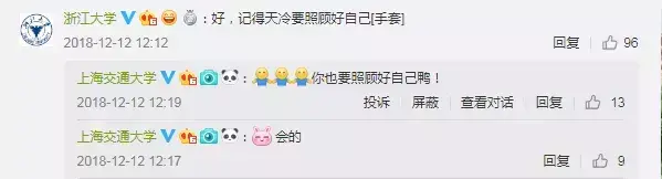 随后,上海交通大学官博也发布同款微博并提及另外两所高校,评论区更吸引有浙江大学官博留言互动。