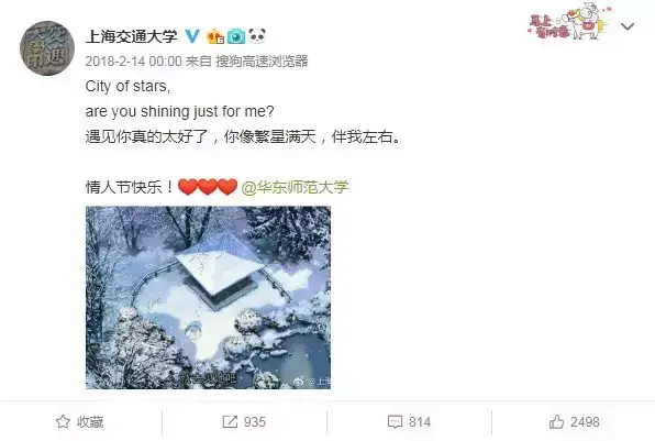2018年2月14日这天,上交又突然高调表白华东师范大学,并得到回应,此举着实引起网友一番探讨,只可惜当事人“变心”太快,广大观众只能看着岁月里的记忆而独自感怀……