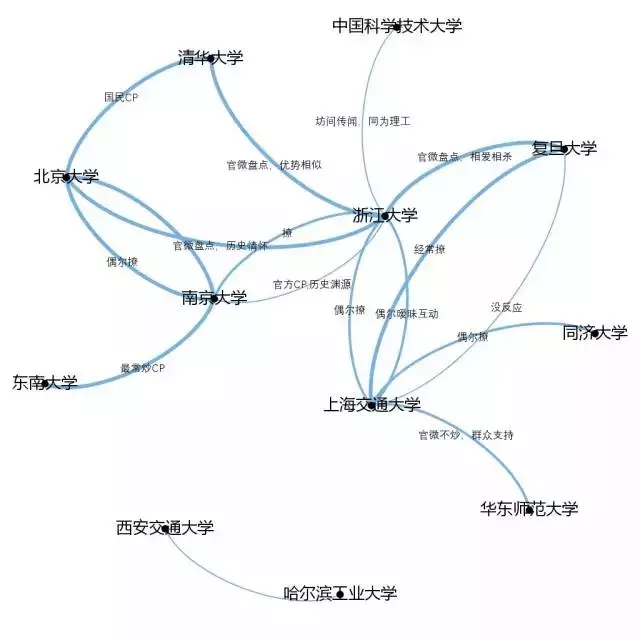 有心人可以从上述微博动态中看出,大部分情况下浙江大学与对其“示好”高校的互动多停留在留言区,而很少看到官博中的公开宣告。有人曾梳理过国内各大高校之间的CP关系图谱,浙大不偏不倚正是处在这张关系图的最中心。