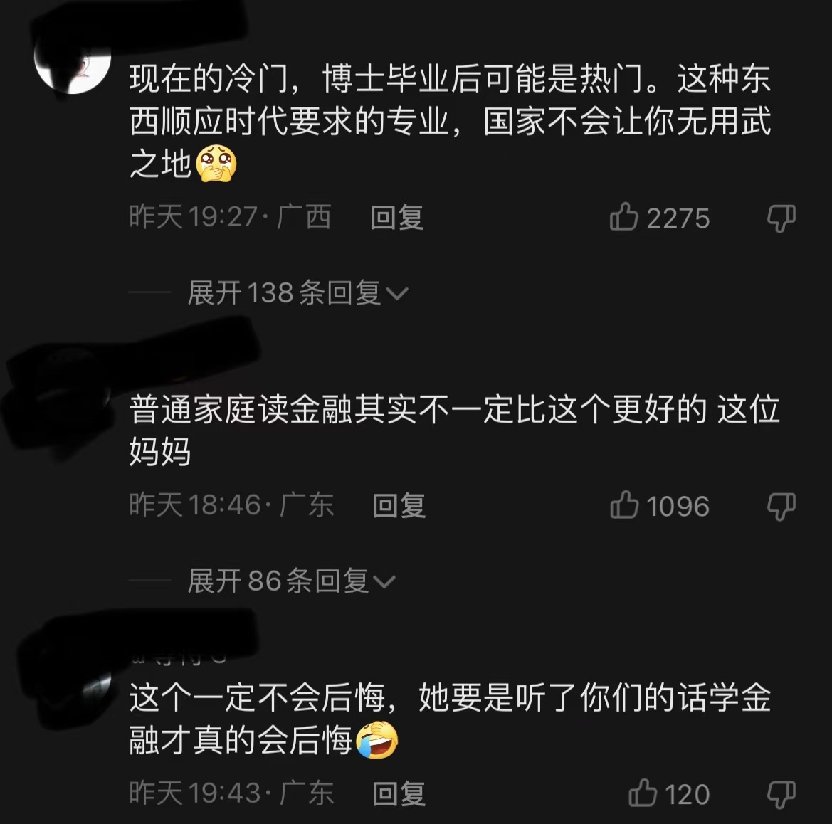 部分网友支持考生的选择,一方面是这个专业是女生自己喜欢的,兴趣就是最好的老师,学喜欢的专业更容易学到极致。