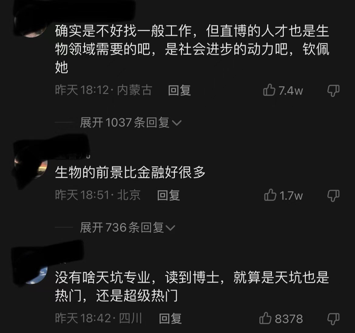另一方面女生是直博,能升到博士就算是天坑专业也不愁就业了,未来就是为国家做贡献的科研人才,很有意义,任何专业读到博士都是高端人才,前景和收入都不会差。
