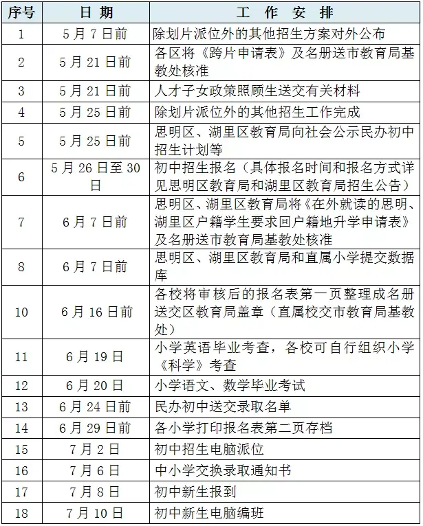 1.思明、湖里区初中招生报名时间为5月26日至30日,具体报名时间和报名方式详见思明区教育局和湖里区教育局招生公告;其他区的报名时间和报名方式由各区教育局确定并公布。