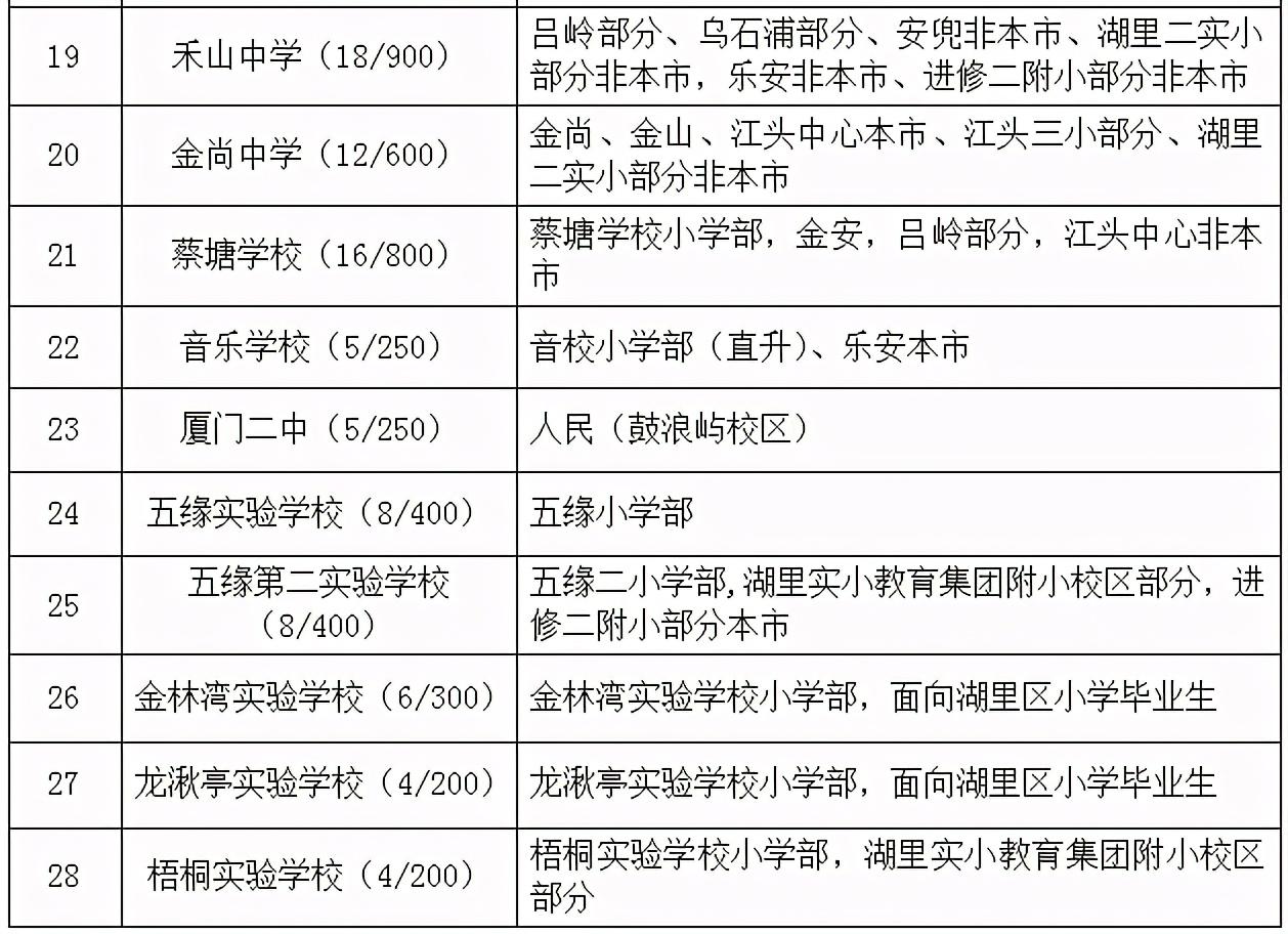 思明、湖里辖区内的公办中学分成28个片区,在各片区内以电脑随机派位的方式进行招生录取。派位时间为7月2日,含政策照顾学生、台生班学生和符合推荐条件的民办小学毕业生的派位。