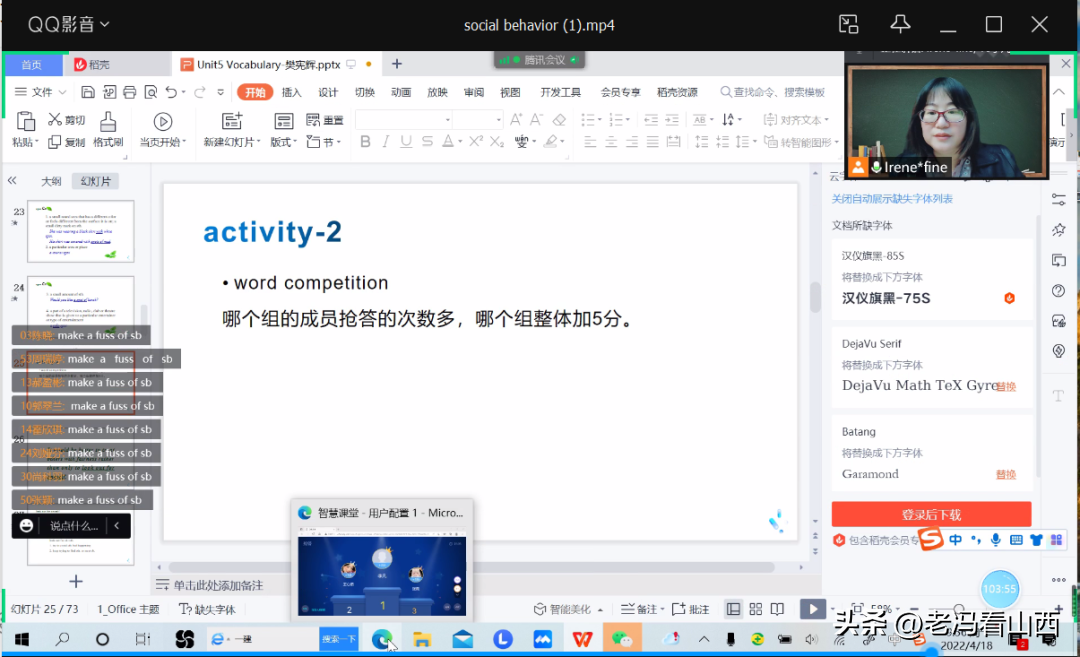 樊宪辉老师的课堂教学注重学生的课堂参与,课前通过投屏设计问卷了解学生的复习预习情况间接了解学生的到课情况。课堂中设计了很多由浅入深的问题,根据学生的学习状态增加了单词抢答、话题讨论集生问生答等形式鼓励不同层次学生参与课堂体验收获。樊宪辉老师还会要求学生出境参与课堂活动,一方面了解了学生的知识掌握情况,一方面考察了学生的学习环境,监督、规避学生上课质量不高或者滑课的现象。