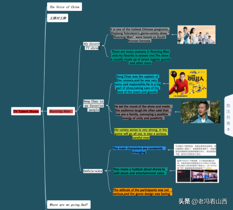 每个单元樊宪辉老师都会根据单元主题设一个项目作业,包括讲故事视频、PPT报告、思维导图、宣传海报等。作业的形式要结合专业,本着服务专业特点而设定,如,学前班的学生作业的布置会在绘画、讲故事、和PPT制作侧重;而计算专业的学生,作业布置侧重访谈数据分析、给视频配字幕进行侧重。