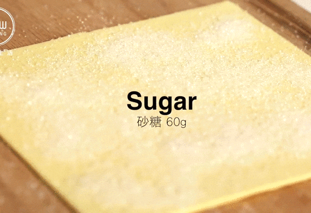 1. 将起酥皮对折后再摊开,会出现一条中线,酥皮上洒上砂糖,两边往中线的地方对折后压紧。