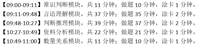 做题时间这一块,不需要和我完全一致。二是要根据自己的知识水平进行适当调整。例如有的考生阅读能力较强,言语理解不需要35分钟;有的考生数理逻辑较强,资料分析也不需要这么21分钟。但是在时间的大致分布上我们需要注意如下事项。