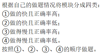 为什么要将数量关系放到最后呢?做过数量关系的考生应该会有这种感受,做出一道数量关系题需要能够获得大量的刺激,非常有成就感。缺点就是很多同学在做数量关系的时候会与题目死磕,总感觉就差那么一点点就出来了,时间就在这种差一点点的感觉中流逝。因此在数量关系放在最后比较合适。