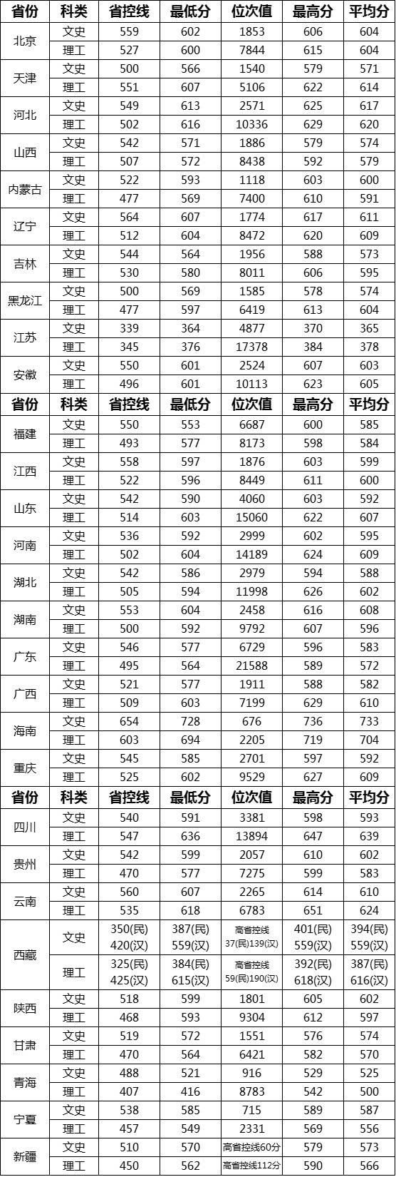 武汉理工大学2019各省录取分数概况