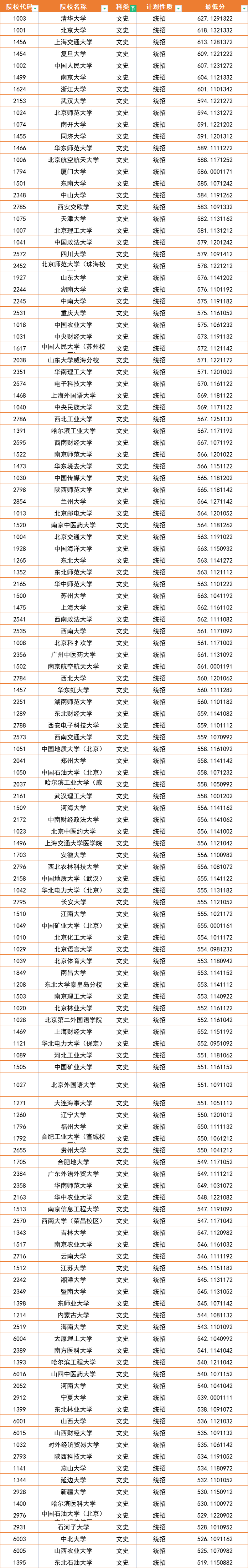 上面说的主要是理科招生,文科招生数据中,录取分数最高的是清华大学,分数是627分,北京大学次之,618分。上海交通大学也是非常给力,与北京大学5分之差,位居第三,复旦大学位列第四,609分。