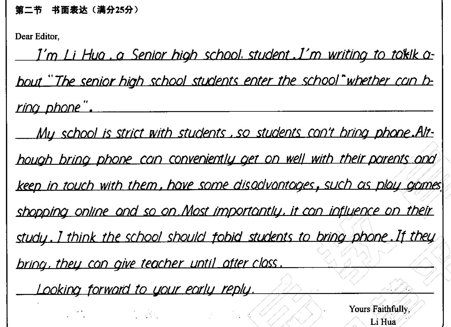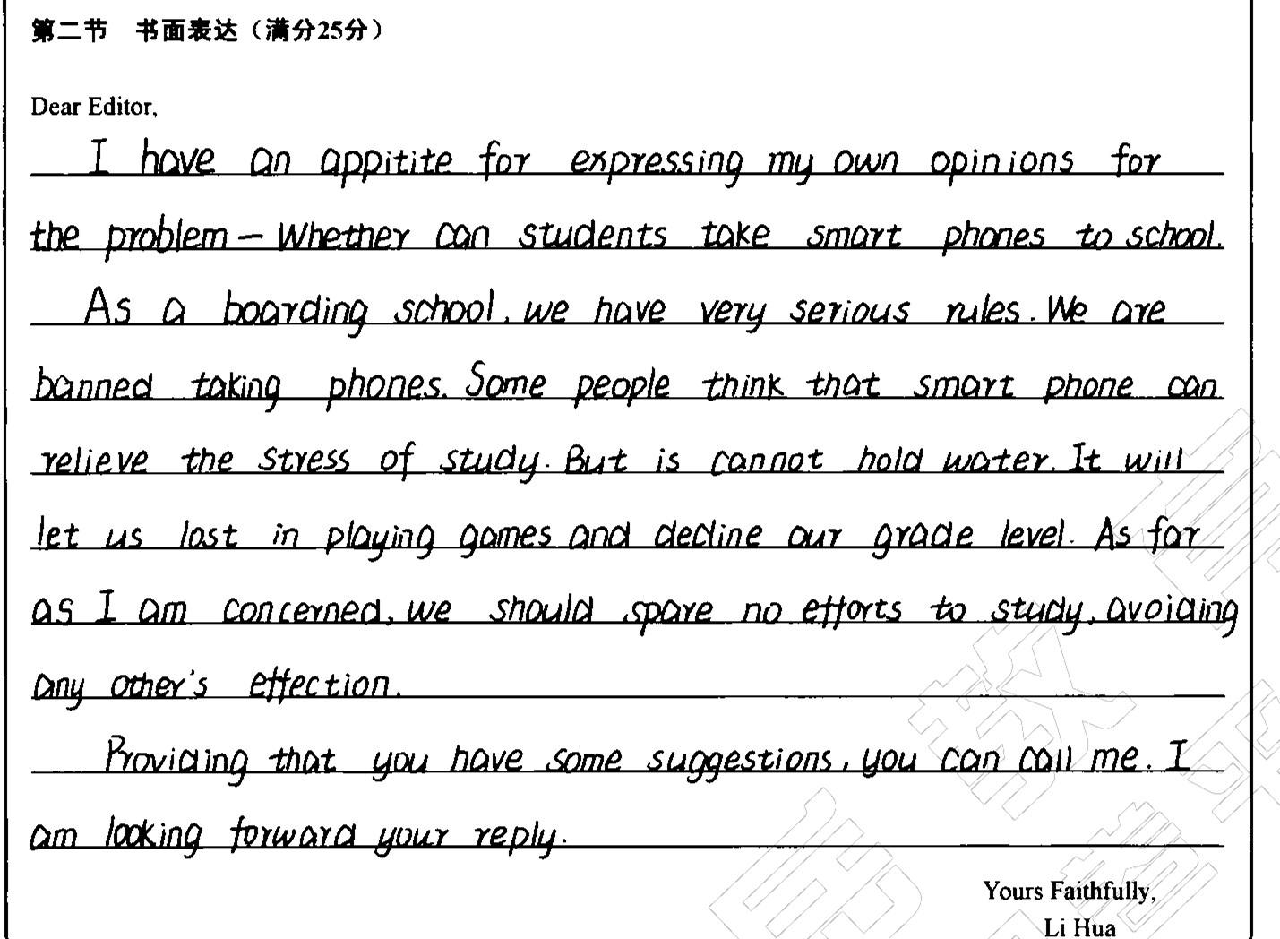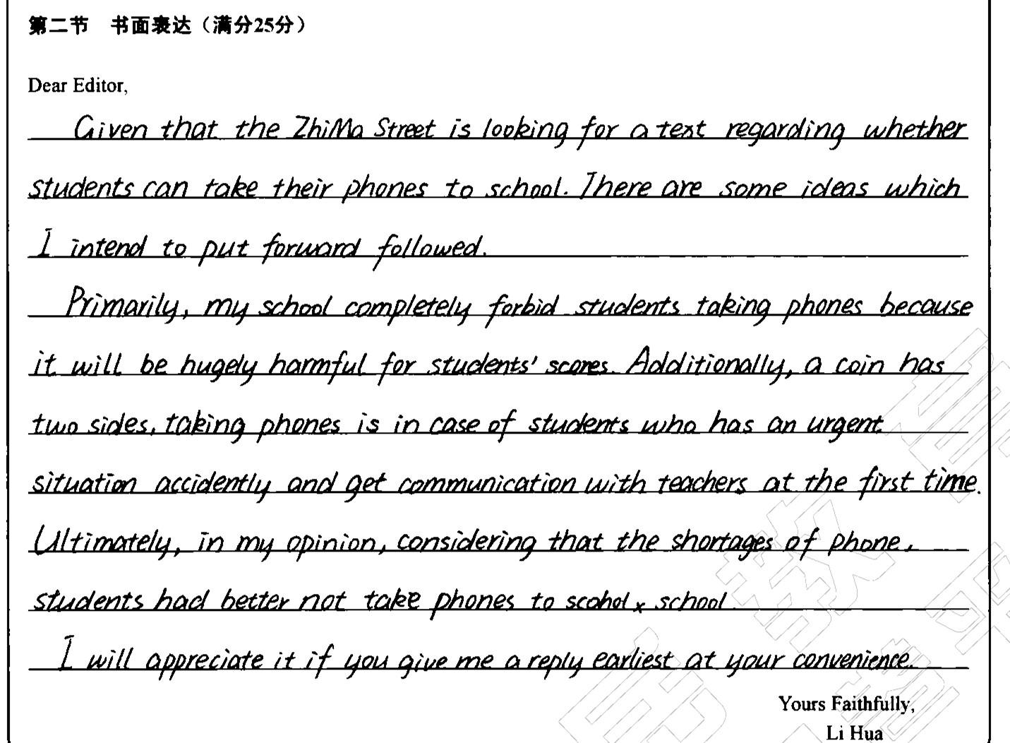 假定你是李华,《芝麻街》杂志征稿讨论“中学生是否能带手机进入学校”问题。请你给编辑写一封信说明你校情况并发表你的看法。要点包括: