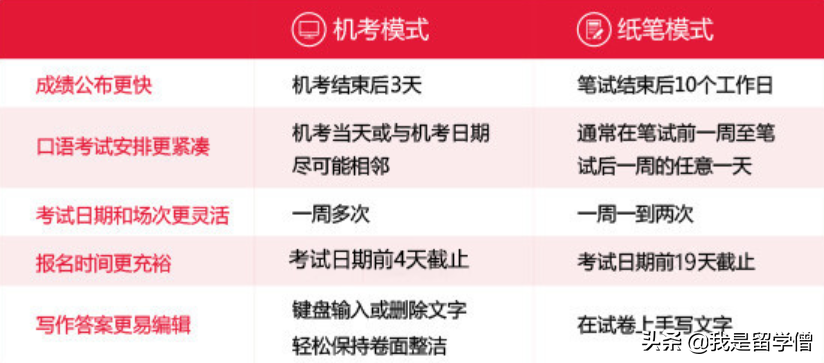 另外,有些考场现在提供机考的模式,其公平性和安全性等和现有的纸笔模式完全相同。机考包含了阅读、听力和写作三个部分,口语还是与考官一对一的面试。