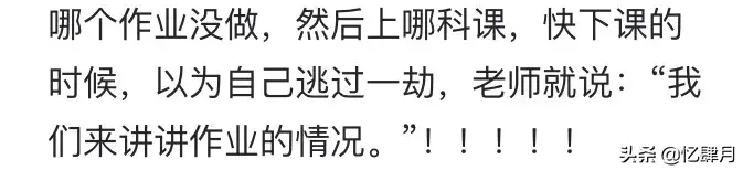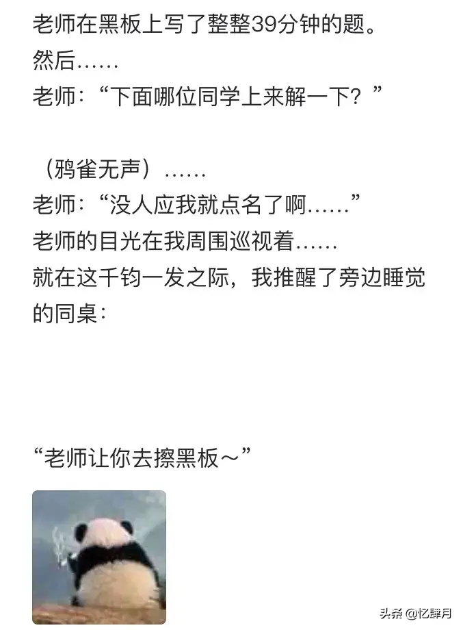 一直特立独行的猪ba 1月前高中考英语听力(因为我们高考英语听力是高三时考两次,好像是取最高分作为高考英语成绩的一部分,记不得了)然后我第一次的时候,中间部分完全是半梦半醒,醉生梦死的听过去的(平时听力训练经常睡觉的我)没办法蒙了五个选择题[捂脸]最后居然考了满分。(怀疑花光了我这辈子的运气)回复25 v05124336732 1月前我很沉默,每次上课都不举手,偏偏我成绩行,上生物课时,老师说:“那个叫徐啥来着,最后一排廷聪明的那个,起来,我要亲自审问你。”当时没把我吓死回复65 用户00287547252 1月前我们政治老师很严但脸盲。一次期末考,考政治,他监场,我就坐在他前面。不知道为啥,一个小时睡过去五六次都是他把我叫醒的。考完了他问我:你是不是我的学生。我笑而不语走了。晚上在教室上晚自习,他值班……回复46 眼泪是回忆的常客 1月前那时候梦见老师来上课,一醒来老师就在讲台上还是同一个老师回复37 幻想的Sakura 1月前前段时间梦见开学,然后醒来才发现还在家里,吓我一跳回复10 扳弯了花 1月前明天开学还考试 我已崩溃️️️回复7 烈扎的小小蛟 1月前上语文课从来不举手,看老师一眼老师就叫我了回复19 第五人格玫瑰超可耐 1月前有次英语考试考睡着了,醒来的时候还有五分钟交卷,我还剩最后两篇阅读。我就第一篇全写了B,第二篇写了TFTFT。竟然全对!妈的,觉了回复7 用户01360145578 1月前有一次我上课睡得正憨,突然同桌拍醒我,说老师让我上去擦黑板,那个时候刚好下课铃响了,但老师一直有拖堂的习惯,所以我就迷迷糊糊走上去,老师还一脸懵,我直接三两下把黑板擦了回复4 用户7054563516860 1月前开学考语文的时候写完就睡了,中途突然一直眼睛睁开了,正做着梦突然看到了语文试卷,反应过来我在考试就又睡了回复4 川军团李四福 1月前高考时,我超常发挥,上了本科。刚到大学报道后一周,每天都做梦自己没考试大学,每次都把自己吓醒回复3 U214660167 1月前上生物课对于我来说就是自习,但是每次生物考试我都是第一名回复4 岁宵 17天前我后桌小声说他想起来站站,然后老师点名点到他答题。回复0 一只小猫咪咪咪 25天前一次考数学,初二九十分钟,因为开考铃不怎么响,于是我先傻坐了将近二分十分钟然后那次是考的最差的一次,2526基本都没做出来回复0 用户2616457162662308 10天前吓死人了