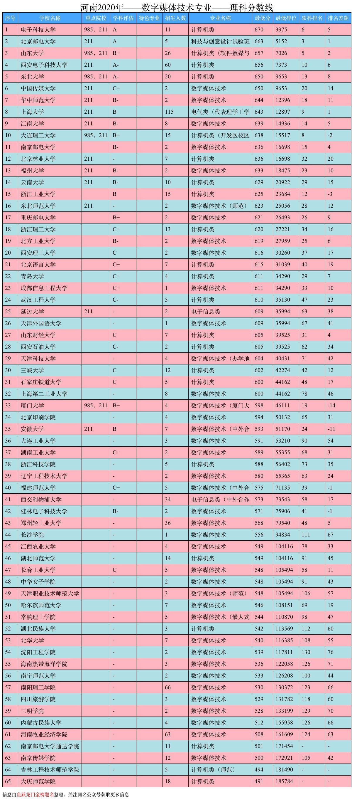 2020年河南省数字媒体技术专业录取分数线,按照分数高低排序