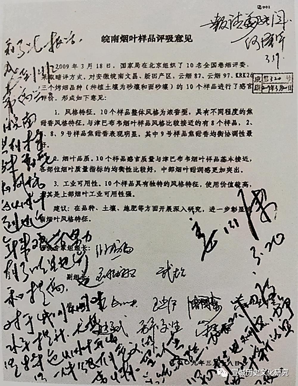 2009年3月18日,国家局在北京组织了10名全国卷烟评委,对宣州区文昌、新田两个乡镇砂壤土、面砂土种植的云烟87、云烟97等共计10个烤烟烟叶样品进行了感官评价,形成了皖南烟叶样品评吸意见报告。