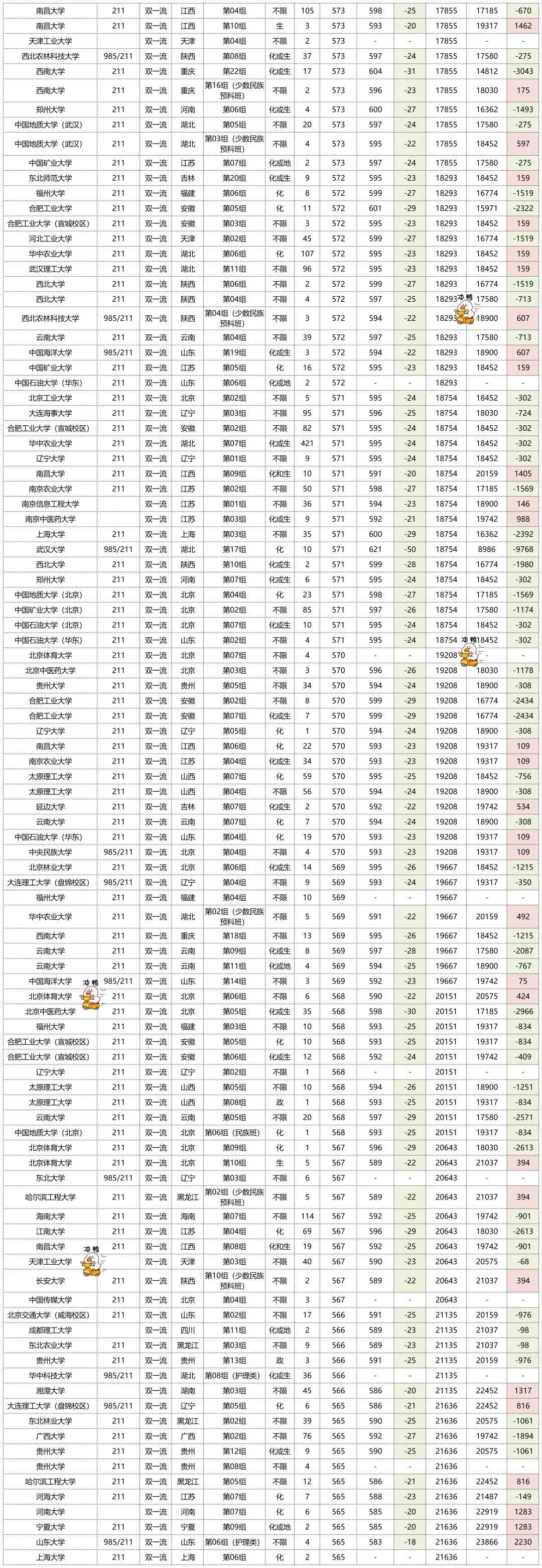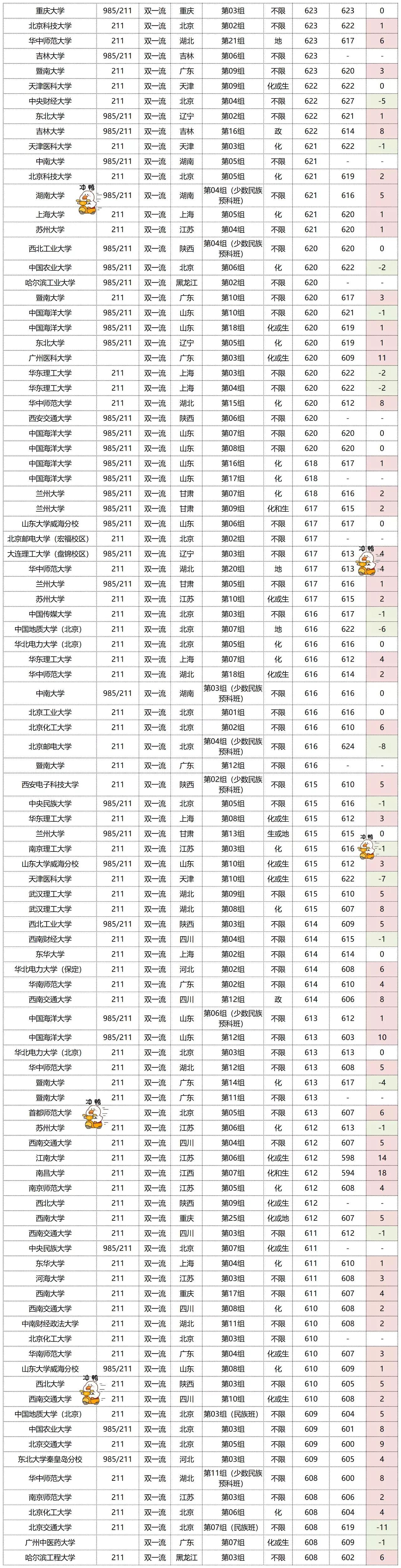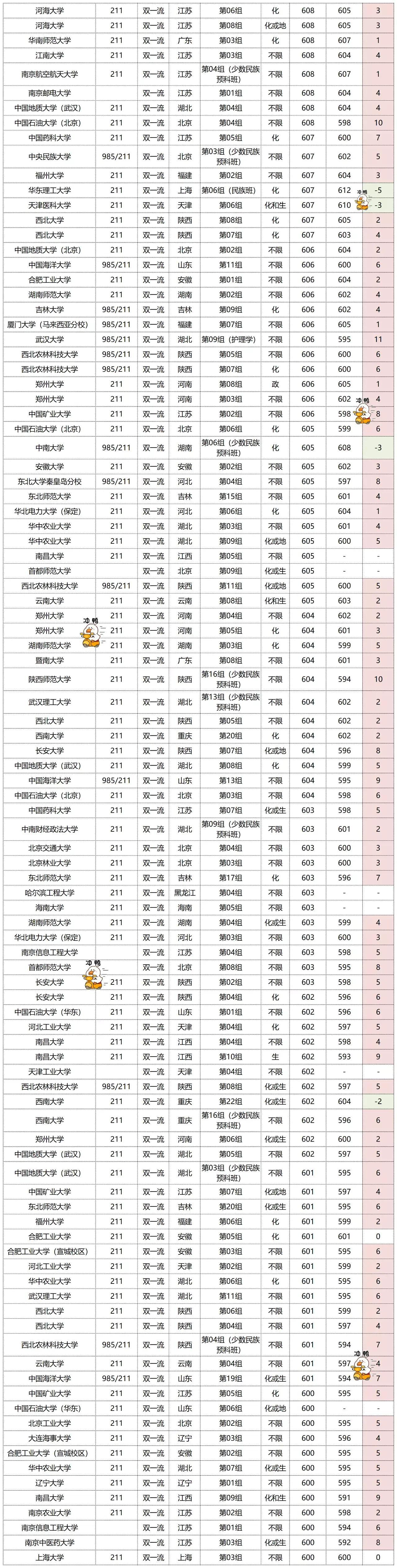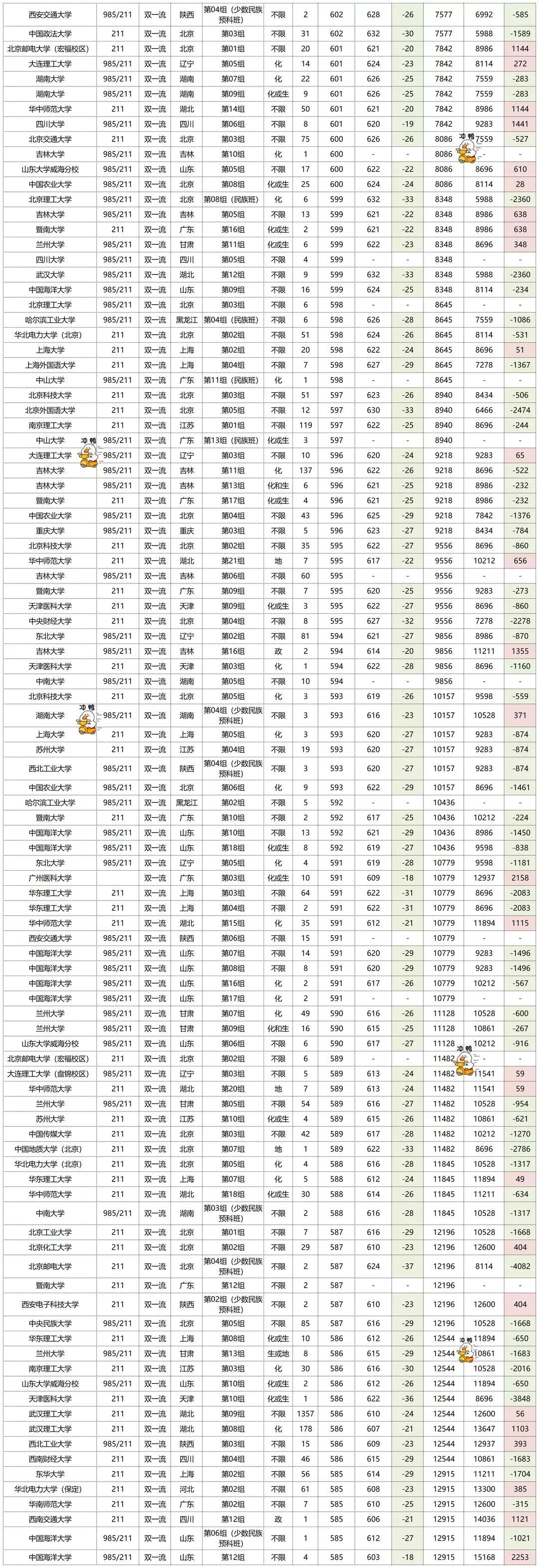 投档线整体呈下降趋势,排名也呈下降趋势。投档线下降最多的是武汉大学的“第17组”,下降了50分,排名也是下降最多的,下降了9768名。排名上涨最多的是广州中医药大学的“第05组”,上涨了17273名,排名也上涨了12分。